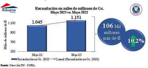 Con relación a la Administración de Aduana de CDE-PIA, dependiente de la DNA, registró superávit del 1,5 % al cierre de mayo de este año, comparado con similar mes del ejercicio anterior. El total recaudado en mayo de 2023 fue de G. 127.886 millones.