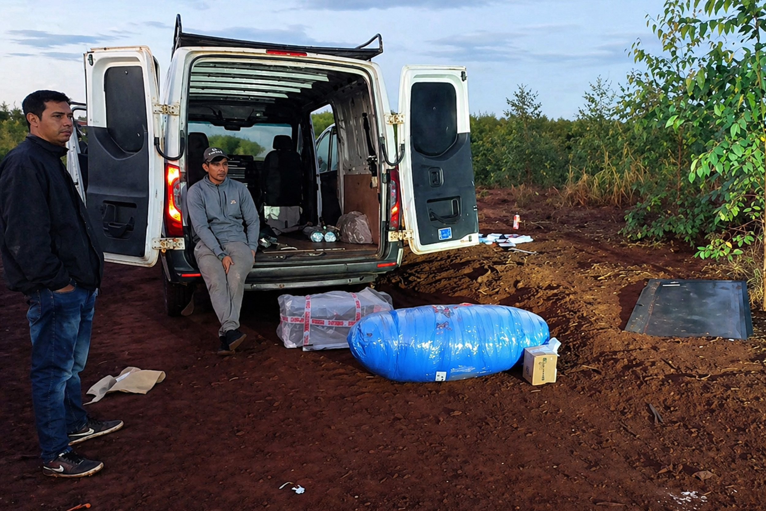 Posteriormente, los asaltantes trasladaron a las víctimas y el furgón hacia un área oscura y boscosa en el kilómetro 28, sobre la Calle 10.000, a unos 10 kilómetros de la ruta internacional. En este sector, que se caracteriza por amplias plantaciones de eucaliptos y nula iluminación, los criminales realizaron el trasbordo de las mercaderías a una furgoneta de color blanco.