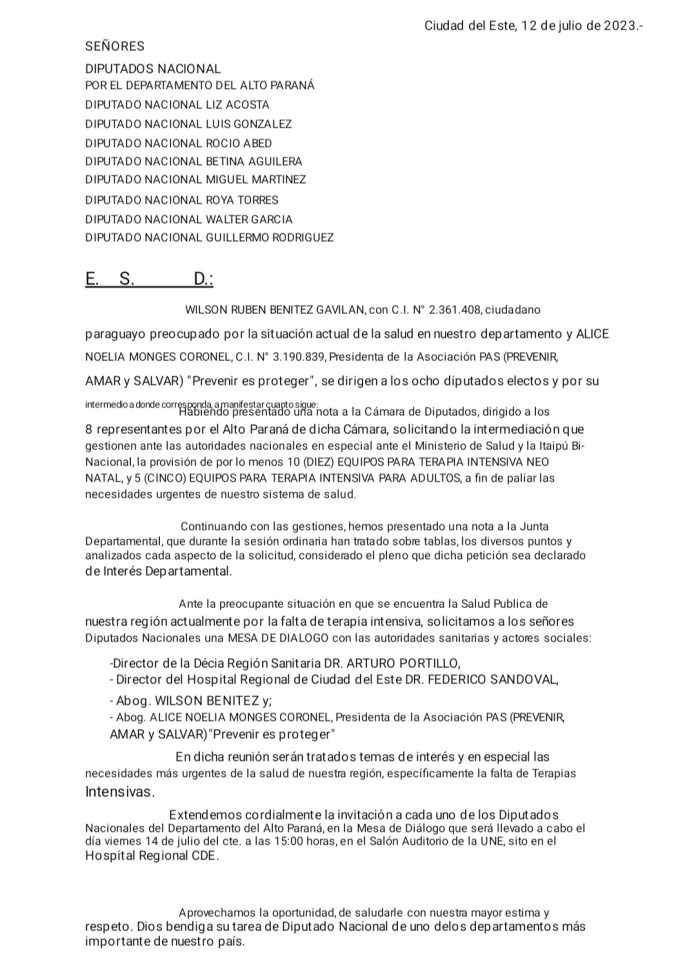La organización había enviado una nota a los diputados departamentales para solicitar su intervención y gestionar la provisión de al menos 10 equipos de terapia intensiva neonatal y 5 para adultos ante las autoridades del Ministerio de Salud y la Itaipú Binacional.
