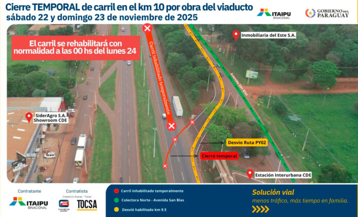 La Superintendencia de Obras y Desarrollo de ITAIPU anunció que este fin de semana será cerrado uno de los carriles de la Ruta PY02 debido a los trabajos del futuro viaducto del kilómetro 10 de Ciudad del Este, obra financiada por la Binacional.