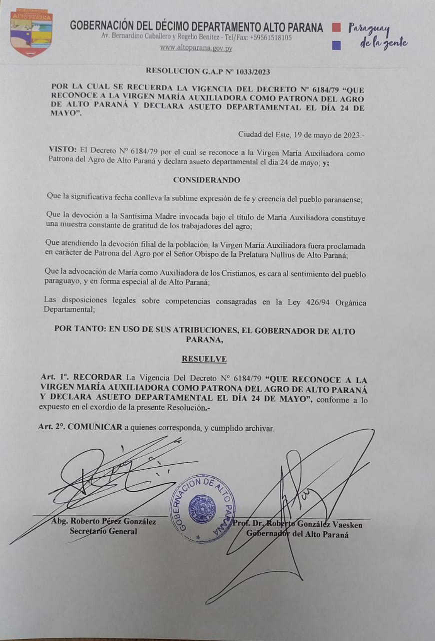 La resolución, firmada por el ejecutivo departamental, Roberto González Vaesken, hace referencia al Decreto N° 6184/79, el cual reconoce a la Virgen María Auxiliadora como patrona del Agro de Alto Paraná. Este decreto sigue vigente y es una muestra del profundo arraigo y devoción.