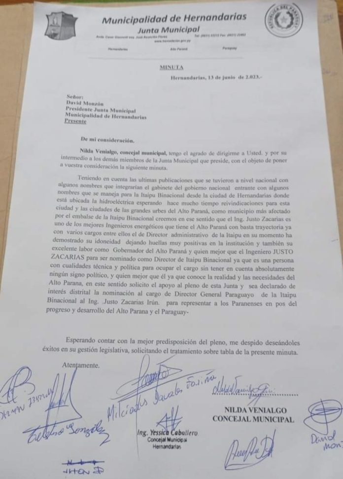 La Junta Municipal de Hernandarias declaró de interés distrital la posible designación de Justo Zacarías como próximo Director General de Itaipú. La Concejal Nilda Venialgo presentó una minuta, pidiendo el apoyo de sus colegas.