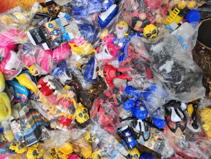 En prosecución a esa causa, en la fecha se procedió a la destrucción de más de 200 cajas de esos juguetes decomisados durante una intervención en el local del ahora condenado. Son productos de las marcas Baby Shark, Advengers, Marvel, Disney, Minnions, entre otros.