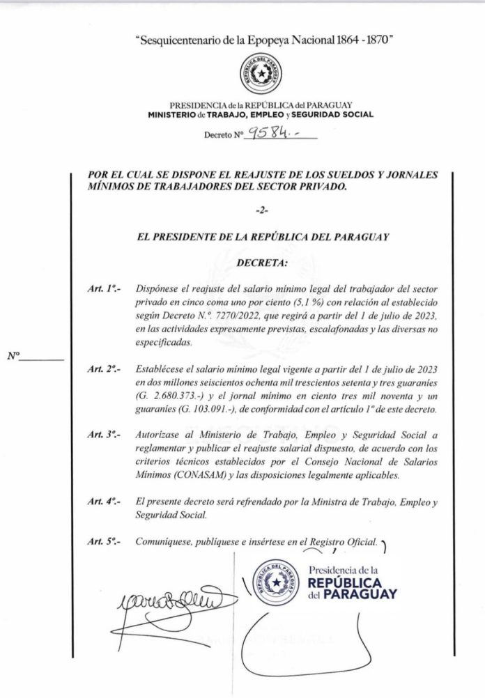 El documento establece el nuevo monto del salario en línea con lo que se venía adelantando desde el Consejo Nacional del Salario Mínimo (Conasam) y entraría a regir desde el próximo 1 de julio, conforme a lo señalado en la ley. En tanto, el jornal mínimo quedaría en G. 103.091.