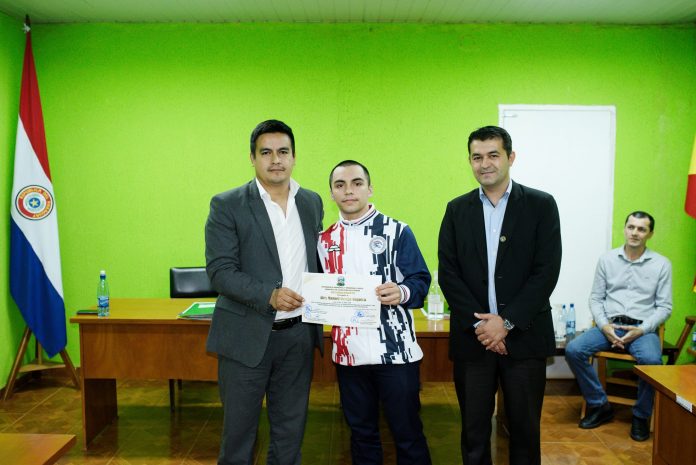 El intendente de Juan León Mallorquín, Elvio Coronel, entregó ayer un reconocimiento a nombre de la Municipalidad, durante la sesión de la Junta Municipal, al joven deportista Alex Ortega, quien integra la Selección Paraguaya de Handball, categoría 18.
