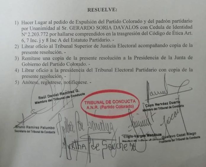 El Tribunal de Conducta de la Asociación Nacional Republicana (ANR), presidido por el abogado Gustavo Cazal, determinó la expulsión del Partido Colorado y del padrón partidario, por unanimidad, a Gerardo Soria Dávalos, por haber trasgredido el código de ética de estatuto partidario.