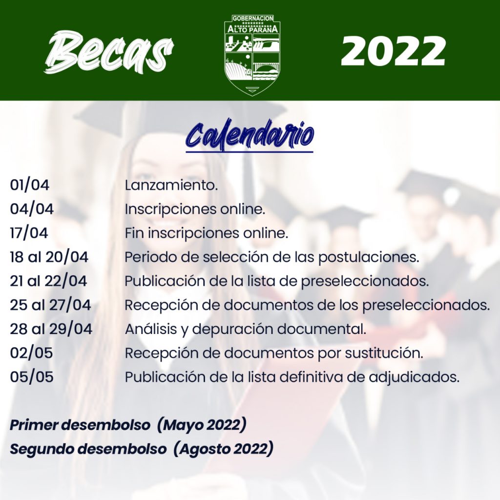 Cabe destacar que las becas serán entregadas como ayudas económicas con un valor de tres millones de guaraníes, en dos pagos, el primero en mayo y el segundo en agosto del año en curso.