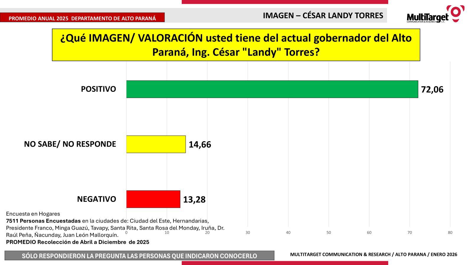 El gobernador del Alto Paraná, César Landy Torres, difundió este viernes 16 los resultados de una encuesta que le atribuye altos niveles de aprobación en gestión e imagen. No obstante, un análisis más detallado del propio material divulgado deja al descubierto limitaciones metodológicas y comunicacionales que relativizan el alcance real de esos números.