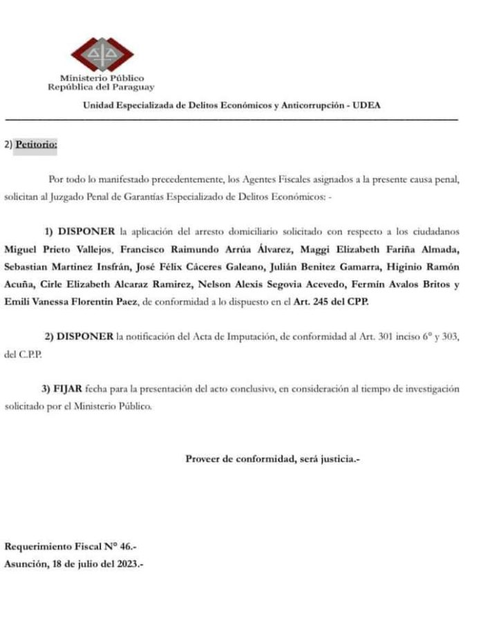 “Se habría ajustado o simulado cadena de compra-venta, en la cual había participado la firma Vanemi SA, cuya representante legal Emili Vanessa Florentín Páez, es del entorno de Prieto”, refiere parte de la imputación.