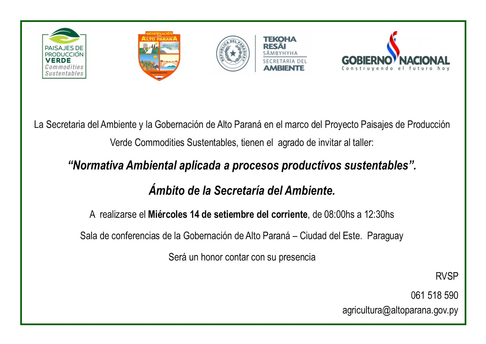 La Secretaria del Ambiente y la Gobernación de Alto Paraná, en el marco del proyecto Paisajes de Producción Verde Commodities Sustentables, invitan al taller “Normativa ambiental aplicada a procesos productivos sustentables”., ámbito de la Secretaría del Ambiente, a realizarse el miércoles 14 de setiembre del corriente, de 8 AM a 12:30 PM en la sala de conferencias de la institución departamental en la capital departamental.