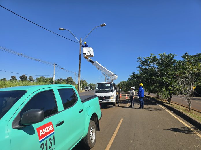 La Administración Nacional de Electricidad (ANDE) avanza con los trabajos de mantenimiento del sistema de alumbrado público sobre la avenida Perú, en el kilómetro 7 Acaray de Ciudad del Este. En los últimos tres días, cuatro cuadrillas de empresas contratistas, bajo supervisión técnica de la ANDE, lograron reacondicionar 283 luminarias en el tramo comprendido entre el viaducto y el Puente Seco.