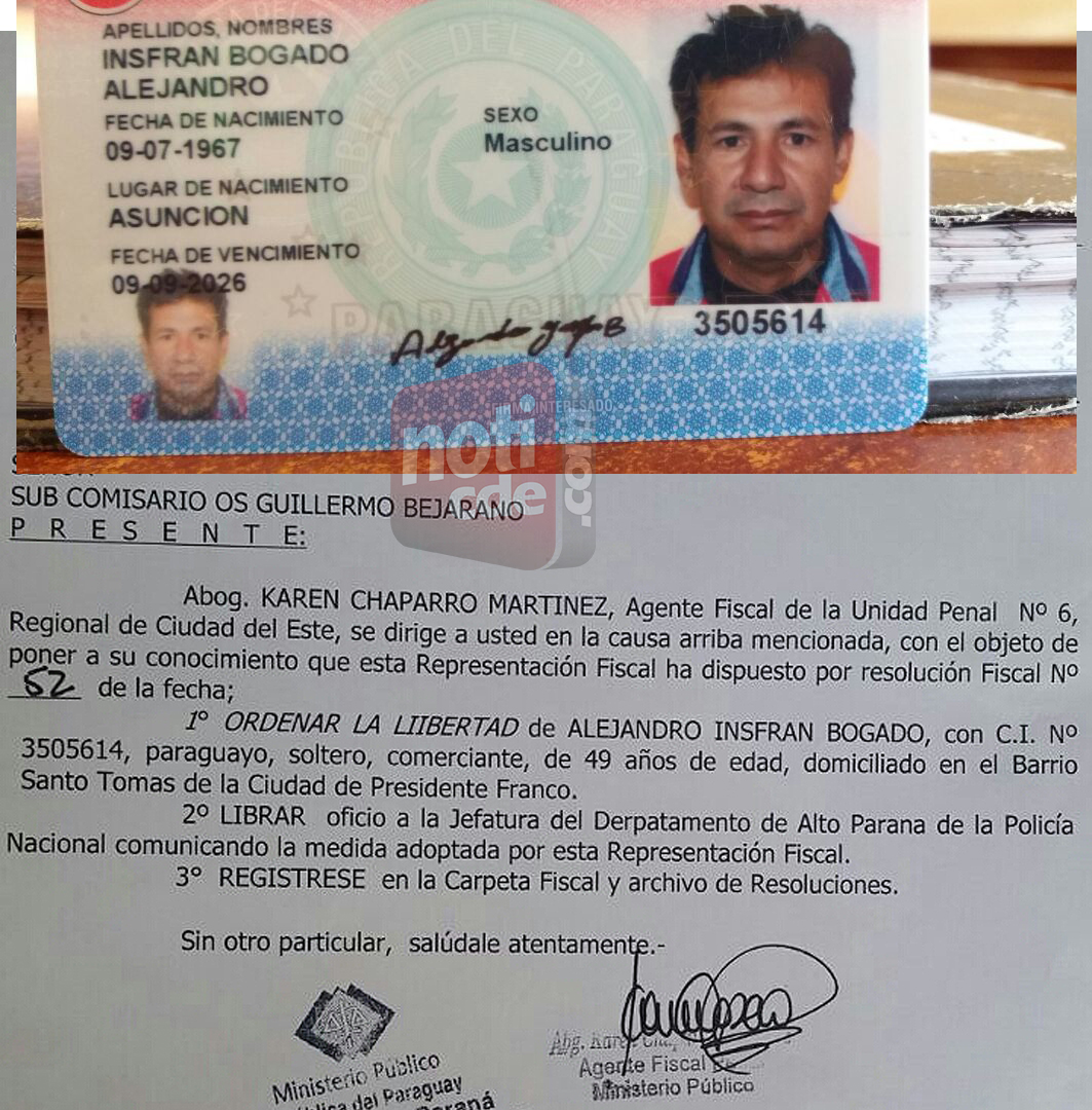 Pero, pocas horas después, la fiscal envió un oficio a la comisaría ordenando la libertad de Insfrán Bogado. La decisión de Karen Chaparro no cayó nada bien en esferas policiales, quienes criticaron la celeridad con que la misma ordenó la libertad del detenido.