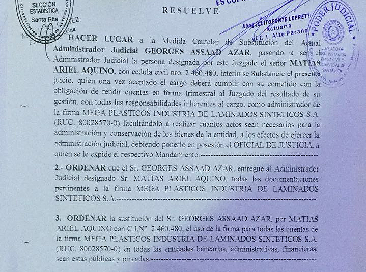 Esta medida, se da luego de que la contraparte del litigio judicial, en este caso Fernando Assaad Barrack Azar, haya sido favorecido por una resolución firmada por la jueza Máxima Meza, medida irregular a todas luces, que fue contestado por los abogados del propietario de Mega Plásticos.