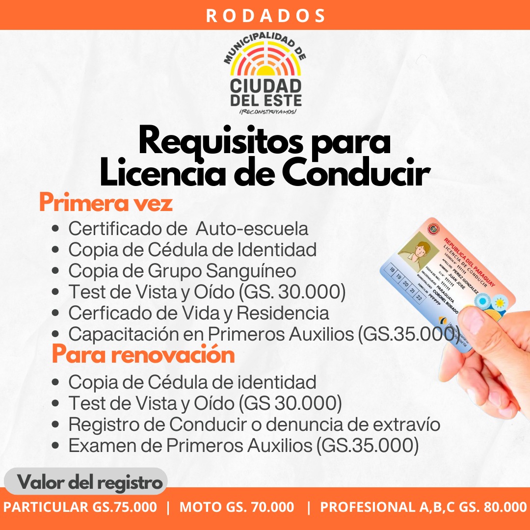 La Municipalidad de Ciudad del Este, a través de la Dirección de Recaudaciones, socializa los requisitos y tarifas para la expedición de licencias de conducir y habilitaciones de vehículos, con el objetivo de informar a la comunidad acerca de los procedimientos necesarios y los costos.