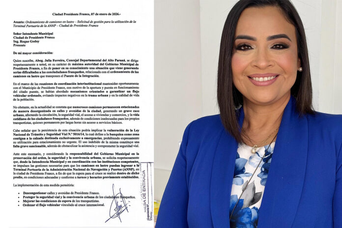 PRESIDENTE FRANCO. La concejal departamental del Alto Paraná, Julia Ferreira, remitió notas formales a distintas instituciones públicas solicitando acciones urgentes para el ordenamiento de los camiones en lastre que aguardan el cruce por el Puente de la Integración, ante el impacto que esta situación genera en la circulación urbana y en la vida cotidiana de los ciudadanos franqueños.