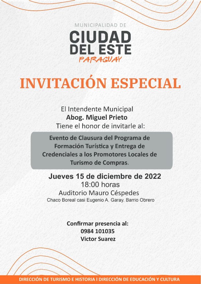 La Municipalidad de Ciudad del Este otorgará los certificados de capacitación a los participantes de la segunda promoción del Programa Municipal de Formación en Turismo Receptivo, cuya clausura tendrá lugar este jueves 15 de diciembre en el Teatro Mauro Céspedes de la Escuela Municipal de Oficios, a las 18:00.