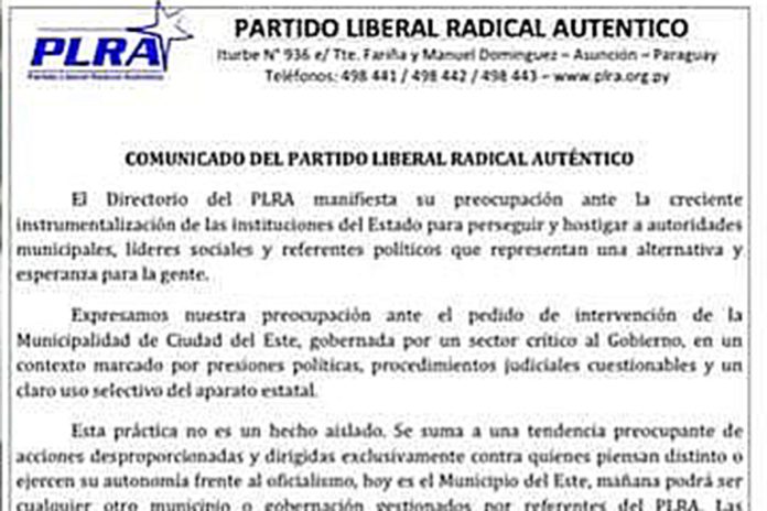 El Partido Liberal Radical Auténtico (PLRA) expresó su preocupación ante el pedido de intervención de la Municipalidad de Ciudad del Este. A través de un comunicado, la agrupación política sostuvo que se estaría utilizando el aparato estatal con fines de persecución política contra sectores que representan una alternativa al oficialismo.