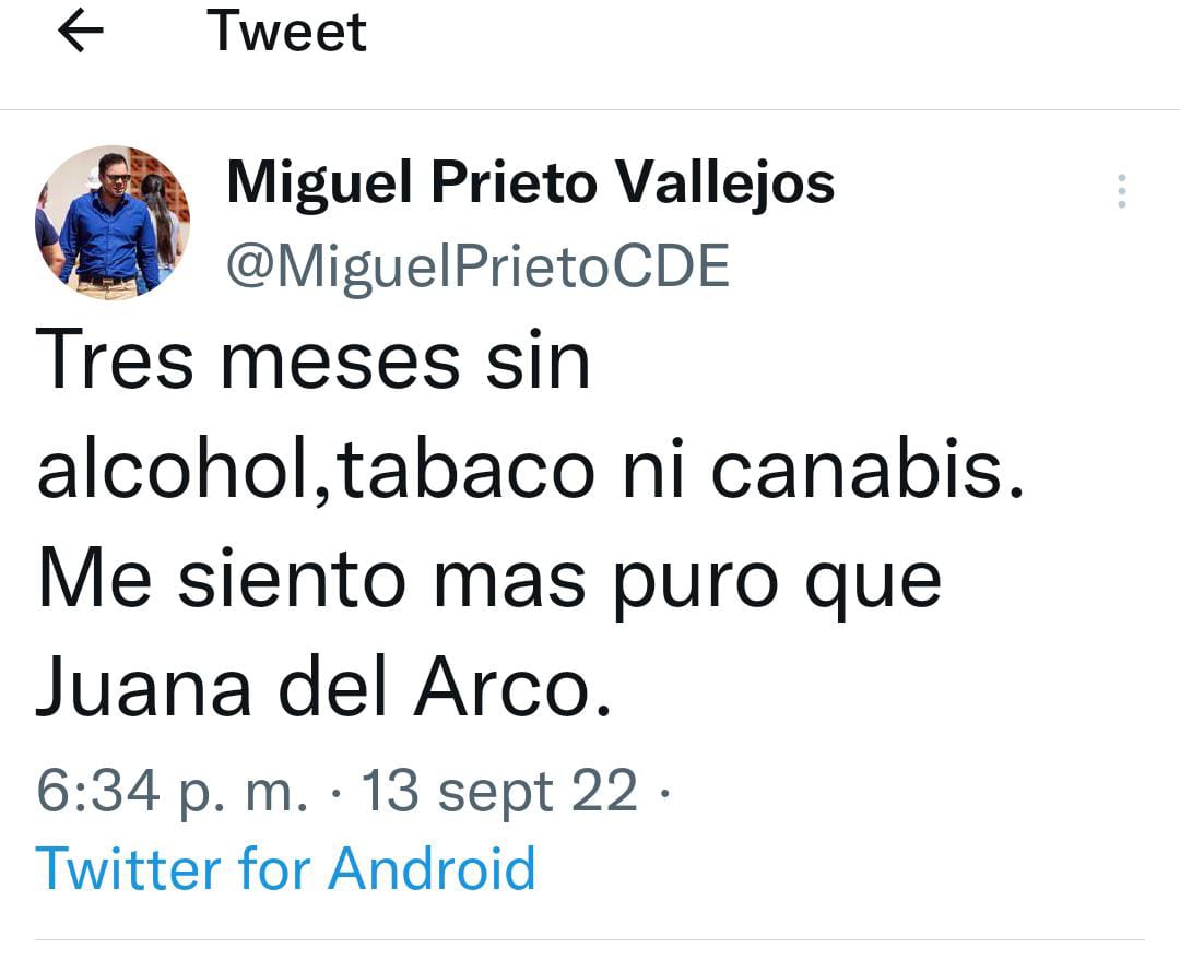 El intendente de Ciudad del Este, Miguel Prieto, publicó en su cuenta de Twitter que hace tres meses no consume alcohol, tabaco ni cananbis.
