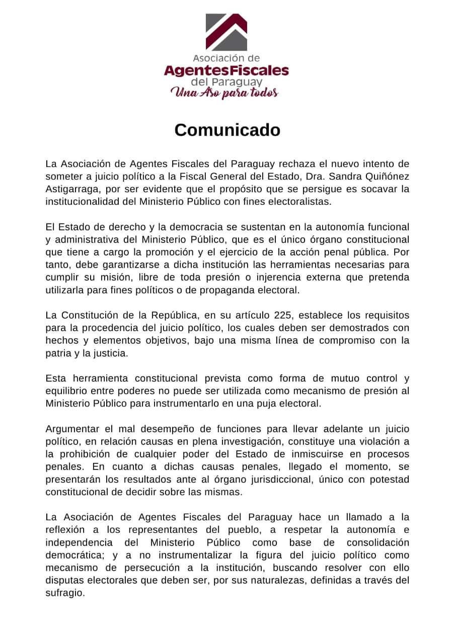 La Asociación de Agentes Fiscales del Paraguay rechaza el nuevo intento (cuarto) de someter a Juicio Político a la Fiscal General del Estado, Sandra Quiñonez, por ser evidente que el propósito que se persigue, es socavar la institucionalidad del Ministerio Público con fines electoralistas.