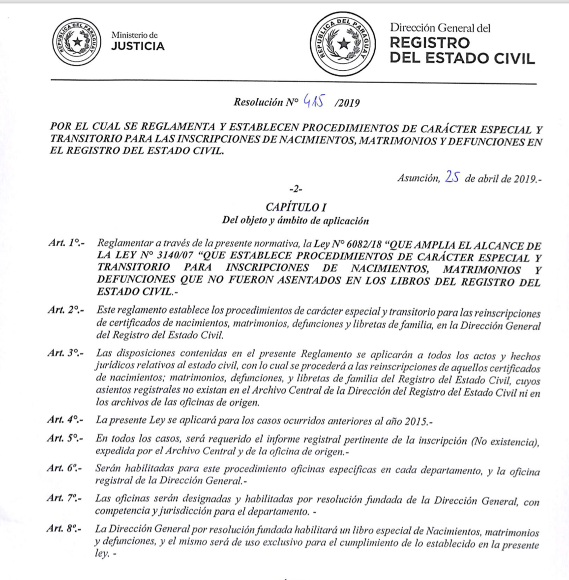 El Registro del Estado Civil (REC) inició el proceso de aplicación de la Resolución Nº 415/19 “Por la cual se reglamenta y establecen procedimientos de carácter especial y transitorio para las inscripciones de nacimientos, matrimonios y defunciones en el Registro del Estado Civil.
