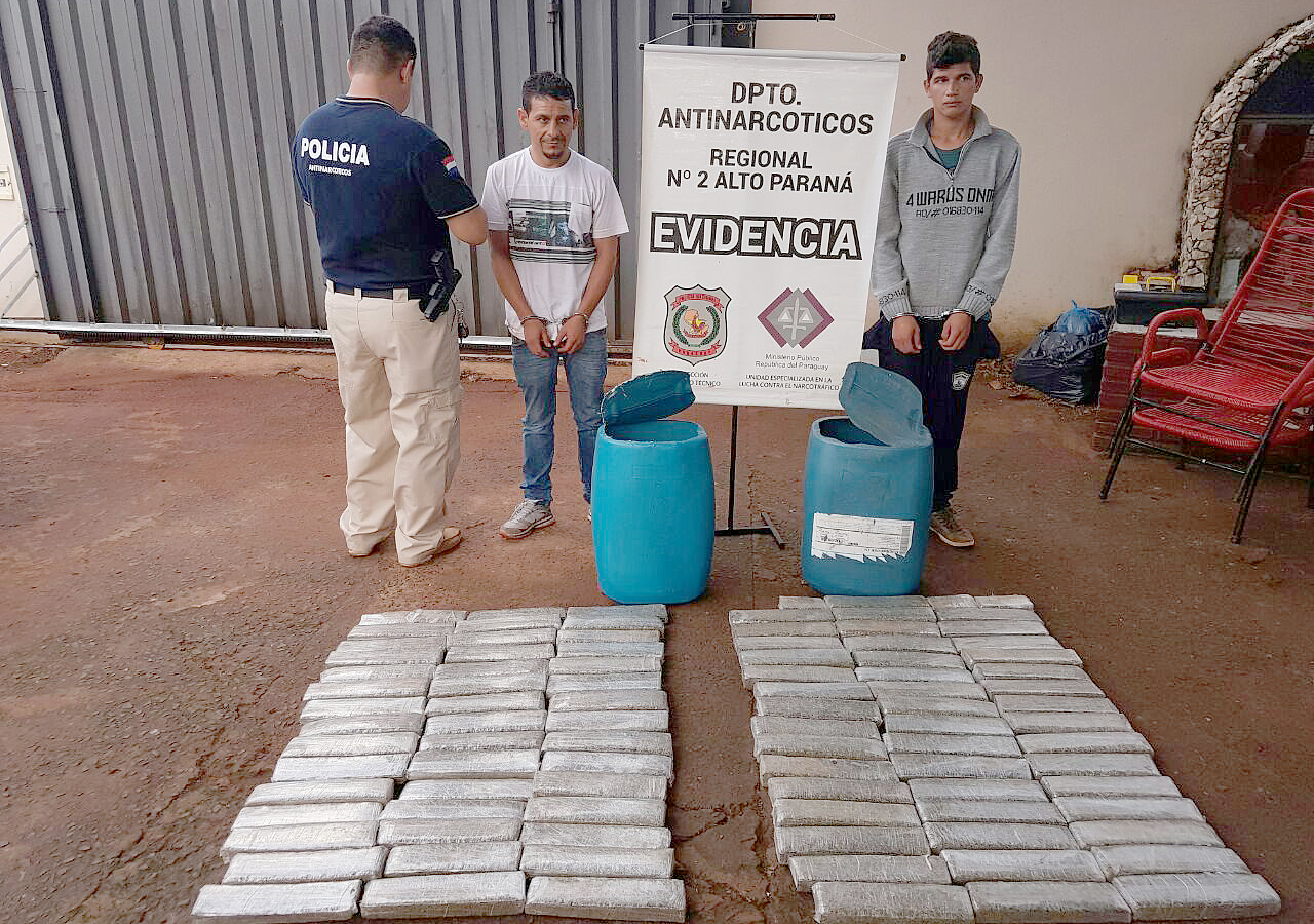 Agentes del departamento antinarcóticos de la Policía Nacional requisaron 80 kilos de marihuana que estaban siendo transportadas dentro de bidones de plásticos en un automóvil y detuvieron a dos hombres. El procedimiento se realizó a las 5:30 de este lunes en el barrio Obrero de Ciudad del Este.