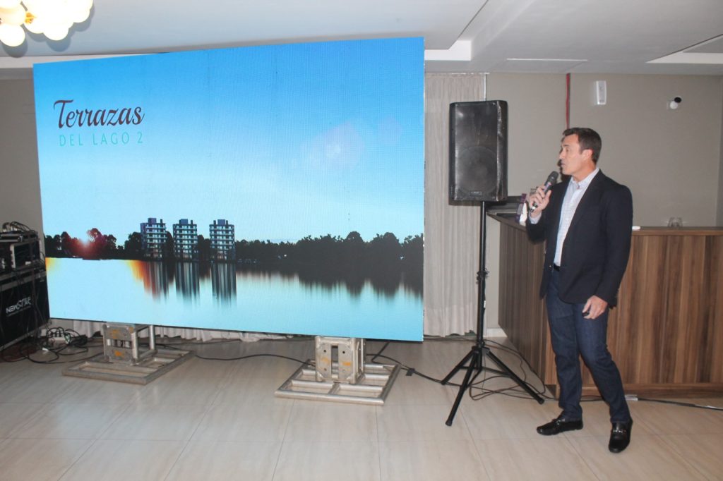 «Actualmente contamos allí con una torre (Terrazas del Lago 1) de seis pisos totalmente vendidos y ahora nos abocamos a la segunda torre. El proyecto prevé la construcción de 10 torres. El complemento principal de este emprendimiento es el Crystal Lagoons, un amenity presente en todos los condominios premium del país y el mundo, cuyo acceso se beneficia el comprador del apartamento».