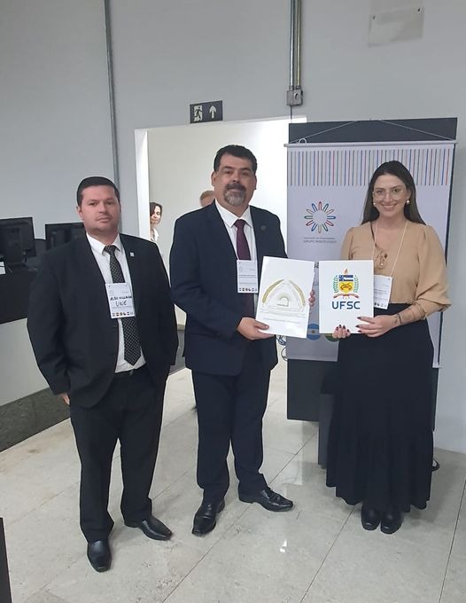 El intercambio del convenio firmado por los rectores estuvo a cargo del Prof. Abg. Ronald Miguel Villalba, director de Relaciones Interinstitucionales de la UNE y la Prof. Mag. Fernanda, directora de Relaciones Interinstitucionales de la UFSC. Asimismo, acompañó el acto, el Prof. Ms. Aldo Villalba Osorio, coordinador docente de la Facultad Politécnica de la UNE.