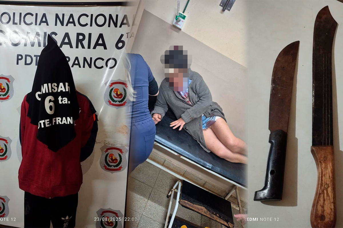 En Presidente Franco, una mujer de 41 años resultó con una herida de machete en la cabeza tras una discusión con su pareja, identificado como Nilson Cano Aguiar, quien fue aprehendido con dos armas blancas en su poder. La víctima debió ser trasladada al Hospital Distrital.